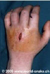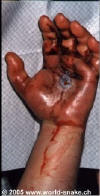 Sehr starke Schwellung und Unterblutungen: Hand,